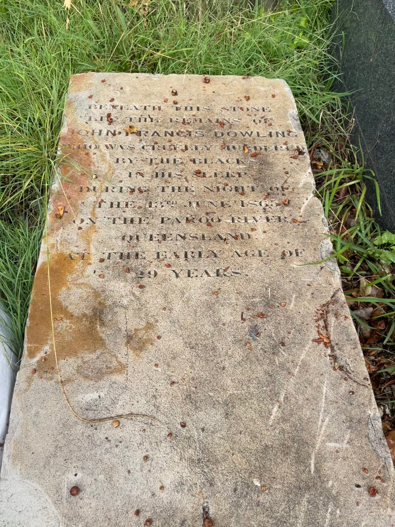 The inscription states: Beneath this stone lie the remains of John Francis Dowling who was cruelly murdered by the Blacks in his sleep during the night of the 13th June 1865 on the Paroo River Queensland at the early age of 29 years.